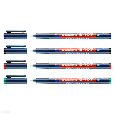 Az EDDING 8407 kábeljelölő marker különféle kábelek rendkívül finom vonalú jelöléséhez és feliratozásához. A kábeljelölő marker tintája permanens, fényálló, gyorsan száradó, vízálló és kopásálló. A készletben a következő színek találhatók: fekete, piros,