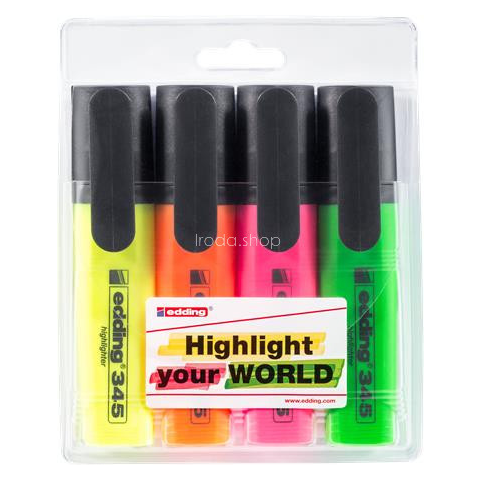 Szövegkiemelő készlet, 2-5 mm, EDDING 345, 4 külnböző szín Fluoreszkáló festékkel töltött szövegkiemelő. -a kiemelt szöveg fénymásolva, a kiemeléssel együtt is jól olvasható -vágott hegy -színválaszték: 4 féle színben (piros, kék, fekete, zöld) -vonal