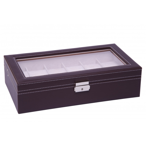 Varrott csokibarna színű mesterséges bőr óratartó doboz 12 órához. Extra nagy óratartó gyönyörű fehér varrással. Belseje plüss, szürke színű! Kialakításának köszönhetően akár 50 mm átmérőjű órákat is rakhat egymás mellé! Ezüst színű stabil zsanér, zárh