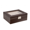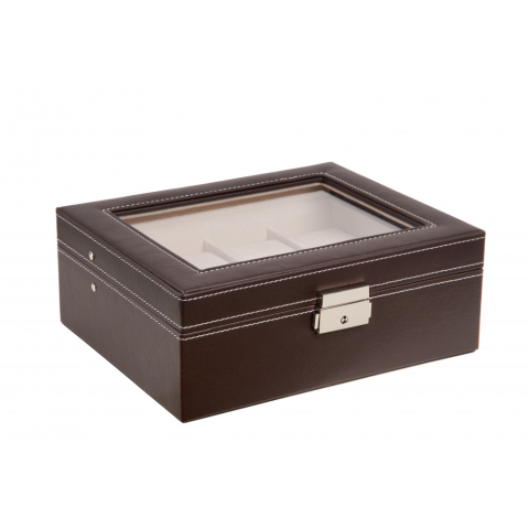Varrott barna bőrhatású óratartó doboz 8 órához. Extra nagy óratartó gyönyörű fehér varrással. Belseje plüss, szürke színű! Kialakításának köszönhetően akár 50 mm átmérőjű órákat is rakhat egymás mellé! Ezüst színű stabil zsanér, zárható, 1 db kulcs tar