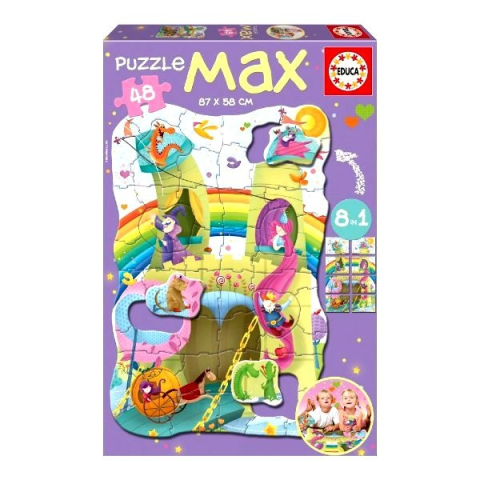 A készletben található 48 kirakós elemből a gyerekek egy mesés hercegnős képet rakhatnak ki