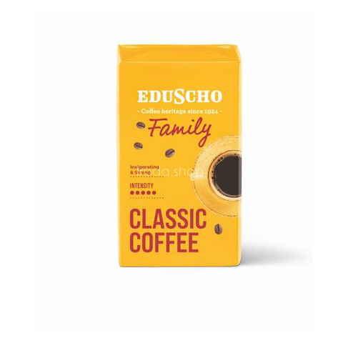 Kávé, pörkölt, őrölt, 1000 g, EDUSCHO Family Élénkítő íz és markáns aroma, a jól ismert társ a kávézásban. A Tchibo Eduscho Family telt aromájával, gazdag és élénkítő ízvilágával kétségkívül elnyeri a kávé szerelmeseinek tetszését. A Tchibo Eduscho Fam
