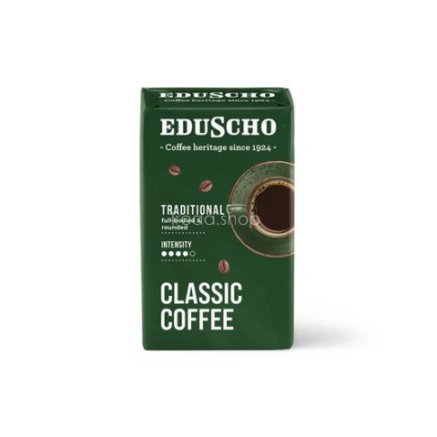 Kávé, pörkölt, őrölt, 250 g, EDUSCHO Classic Traditional Ezzel a hagyományos kávéval olyan, mintha öröm költözne a csészédbe. Az aromás, Brazíliából származó kávészemek és az intenzív vietnami Robusta kávészemek együttesen karakteres kávéélményt biztos
