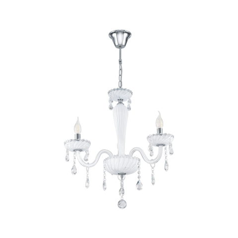 Az Üveg csillár kristály díszekkel - Carpento Eglo 39112 egy klasszikus stílusú függesztett lámpatest, amely fehér és áttetsző színű fém és üveg anyagokból készült. A lámpatest három darab E14 foglalattal rendelkezik, amelyekhez cserélhető fényforrás szük