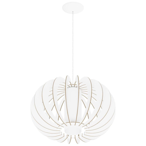 A Stellato Eglo 95607 függesztett lámpa egy modern stílusú világítótest, amelyet fehér és fekete színkombináció, valamint acél és fa anyaghasználat jellemez. A lámpatest 50 cm átmérőjű, maximális magassága 150 cm. Egy darab E27-es foglalattal rendelkezik,