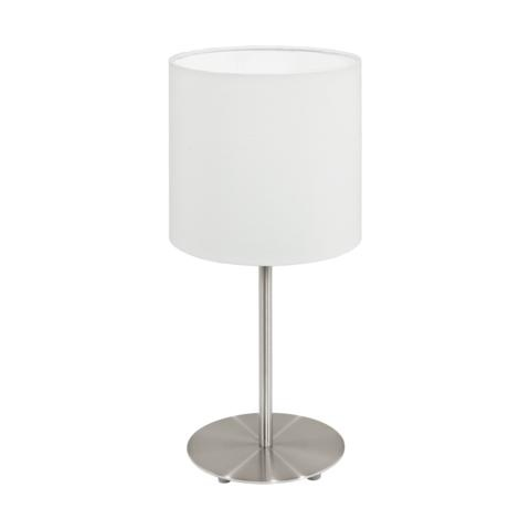 Az Eglo Pasteri 95725 asztali lámpa modern stílusú, fehér és ezüst színű kivitelben készül, acél és textil anyagok felhasználásával. A lámpa magassága 27,5 cm, átmérője 14 cm, tömege 0,71 kg. Egy darab E14 foglalattal rendelkezik, amelybe cserélhető fényf