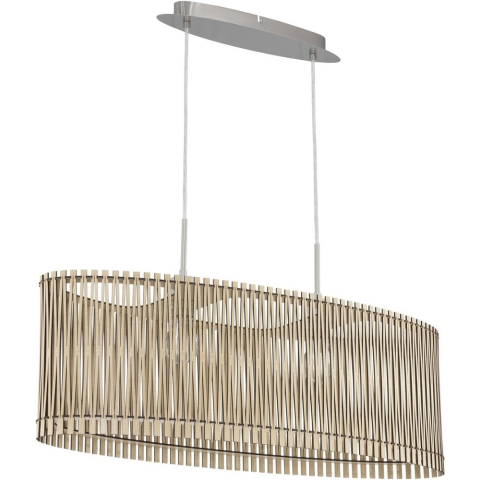 A Sendero Eglo 96194 függesztett lámpa két E27-es foglalattal rendelkezik, így cserélhető fényforrásokkal használható. A lámpatest modern stílusú, barna és fa színkombinációval készül, anyaga acél és fa. Mérete 77,5 cm hosszú, 25 cm széles, maximális maga