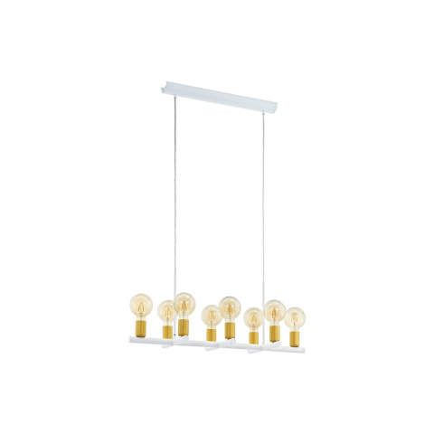 Az Adri Eglo 97448 függesztett lámpa nyolc E27 foglalattal rendelkezik, amelyekbe cserélhető fényforrás helyezhető. A lámpatest acélból készült, fehér és arany színkombinációval, amely vintage stílust képvisel. A termék teljes tömege 3,35 kg, méretei 785