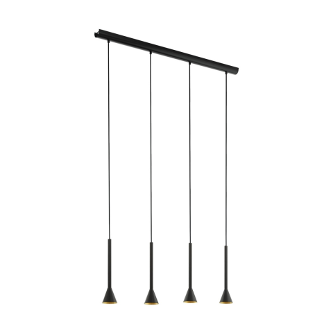 A Cortaderas Eglo 97605 függesztett lámpa négy GU10 foglalattal rendelkezik, melyekhez cserélhető fényforrások tartoznak. A lámpatest acélból készült, felülete fekete és arany színű, minimál stílusban tervezve. A termék teljes hossza 1130 mm, szélessége 8