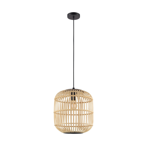 A Bordesley Eglo 43216 függesztett lámpa 35 cm átmérőjű, etno stílusú világítótest, amely fa és acél anyagok kombinációjával készült, fa-fekete színben. A lámpatest egy darab E27 foglalattal rendelkezik, amelyhez a fényforrás külön vásárolható meg, így a