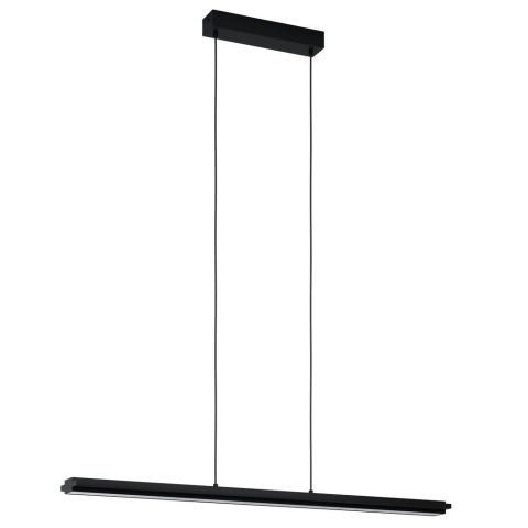 CAMBULOS LED függőlámpa hosszú, négyszögletes felfüggesztett fém elemmel rendelkezik fekete színben. A rúd közepén fehér akrilból készült fénypanel diffúzor található. Az integrált LED-ek meleg fehér fényt bocsátanak ki lefelé, és a falon lévő koordináló ..
