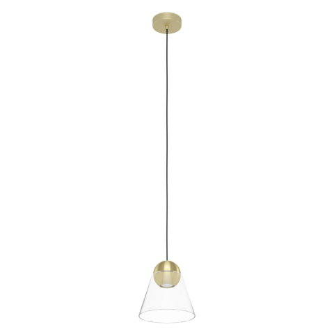 A CERASELLA LED-es függőlámpa kúpos, átlátszó üvegbúrával rendelkezik, amelyhez egy szálcsiszolt sárgaréz bevonatú fém gömb tartozik. A termék divatos dizájnját a szálcsiszolt sárgaréz bevonatú fém mennyezeti konzolok és fekete textilkábel teszik teljessé..