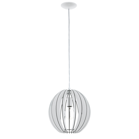 A Cossano Eglo 94438 fehér színű függesztett lámpa modern stílusú lakásvilágítási megoldás, amely egy darab E27 foglalattal rendelkezik. A lámpatest acélból és fából készült, átmérője 300 mm, magassága 1100 mm. A fényforrás cserélhető, a lámpa nem tartalm