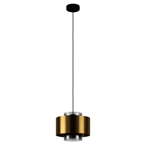 A DUGLIA függesztett lámpa arany színű fémbúrával rendelkezik, belsejében füstölt fekete üvegtesttel. A lámpaernyő kerek fekete fém ernyőre van felfüggesztve fekete textil kábellel. Elegáns dizájnjával a függesztett lámpa jól illeszkedik a modern belső te..