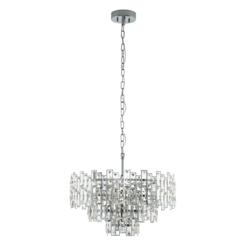 A Calmeilles Eglo 39626 art deco stílusú kristály csillár a glamour jegyében készült, modern lakásvilágítási megoldás. A lámpatest 63 cm átmérővel és 150 cm magassággal rendelkezik, anyaga acél és áttetsző kristály, felülete króm színű. A csillár tíz dara