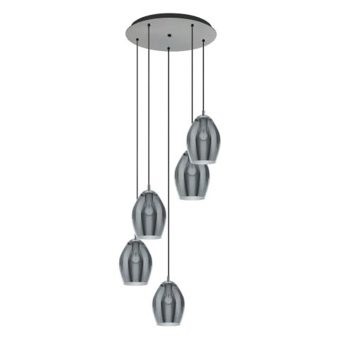 Az Estanys Eglo 39567 függesztett lámpa öt darab E27 foglalattal rendelkezik, amelyek cserélhető fényforrásokkal használhatók. A lámpatest acélból és üvegből készült, nikkel és füstszínű felülettel. A termék design stílusú, átmérője 580 mm, maximális maga