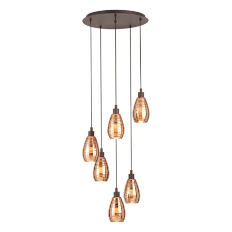 A Siracusa Eglo 39508 egy hat foglalattal rendelkező függesztett lámpa, amelyet barna és vörösréz színkombináció, valamint acél és üveg anyaghasználat jellemez. A lámpatest 6 darab E27-es foglalattal van ellátva, amelyekhez cserélhető fényforrás használha