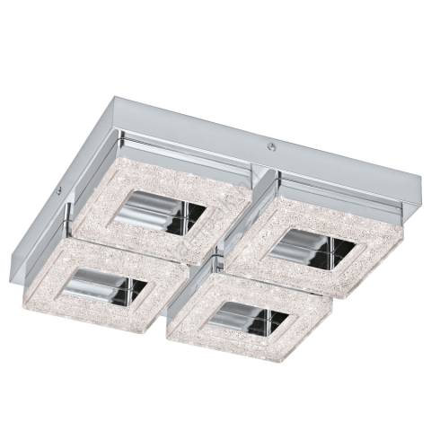 FRADELO LED mennyezeti lámpa négyzet alakú króm színű fémtesttel és négy átlátszó műanyag világítóelemmel rendelkezik, amelyek belsejében átlátszó szemcsés kristályok találhatók. Ezek a kristályok csillogó, csúcsminőségű megjelenést kölcsönöznek, míg az i..