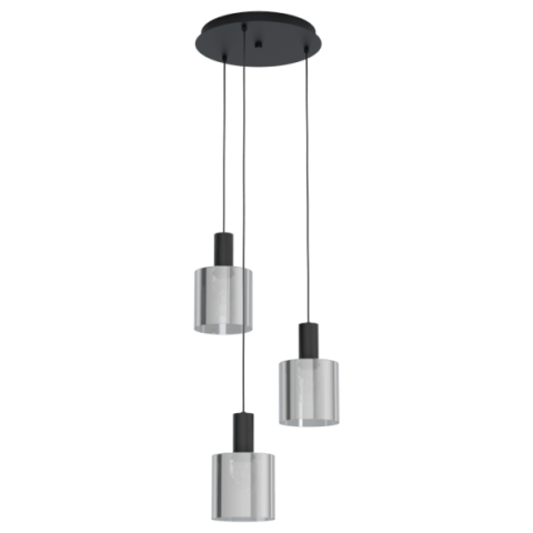 A Gorosiba Eglo 98754 függesztett lámpa három darab E27-es foglalattal rendelkezik, amelyek cserélhető fényforrásokat tesznek lehetővé. A lámpatest modern stílusban készült, acél és üveg anyaghasználattal, fekete-füstszínű színkombinációban. A termék átmé