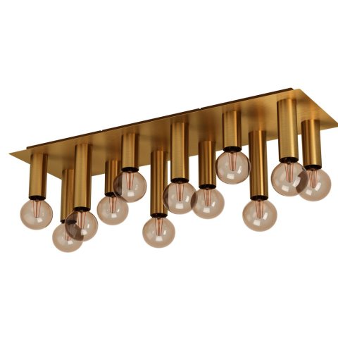 A MARZENO mennyezeti lámpa téglalap alakú, szálcsiszolt sárgaréz fém talpa tizenkét hengeres lámpatartóval készült. A különböző magasságú hengerek a látható izzókkal kombinálva gyönyörűen kiegészítik a dizájnt. Ez a modern mennyezeti lámpa divatos sárgaré..