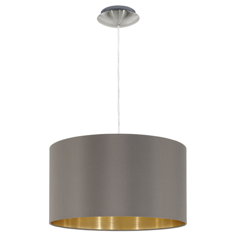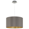 Ez a MASERLO sorozatú függesztett lámpatest szatén nikkel acélból és Cappuccino és arany színű szövetből készült. Védőszigeteléssel rendelkezik, a világításához E27-es lámpa szükséges...