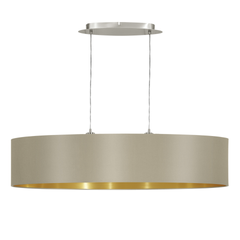 Ez a MASERLO sorozatú függesztett lámpatest szatén nikkel acélból és szövetből készült, szürke és arany színben. Védőszigeteléssel rendelkezik, és két E27-es lámpa szükséges a ragyogáshoz...