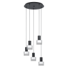 A Molineros Eglo 39727 függesztett lámpa öt darab GU10 foglalattal rendelkezik, amelyek mindegyike cserélhető fényforrást tartalmaz. A lámpatest acél, üveg és műanyag felhasználásával készült, színvilága fekete, áttetsző és fehér árnyalatokban jelenik meg