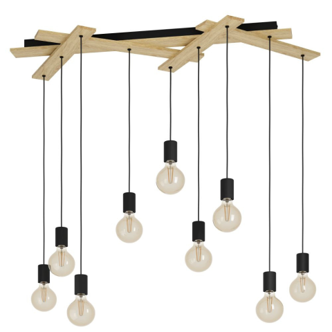 A Monmount Eglo 43641 csillár zsinóros függesztéssel és kilenc E27 foglalattal rendelkezik, melyek különféle cserélhető fényforrásokkal kompatibilisek. A lámpatest fő anyaga acél és fa, színvilága fekete és fa kombináció, amely modern megjelenést biztosít