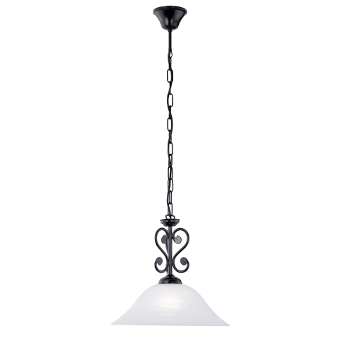 A MURCIA függőlámpa kerek, fehér alabástromüveg lámpabúra fekete láncra függesztve. Az üveg lámpabúra és a bonyolult fekete fémelemek gyönyörű kombinációja klasszikus megjelenést kölcsönöz a függőlámpának. Kiválóan illeszkedik a házikó stílusú belső terek..