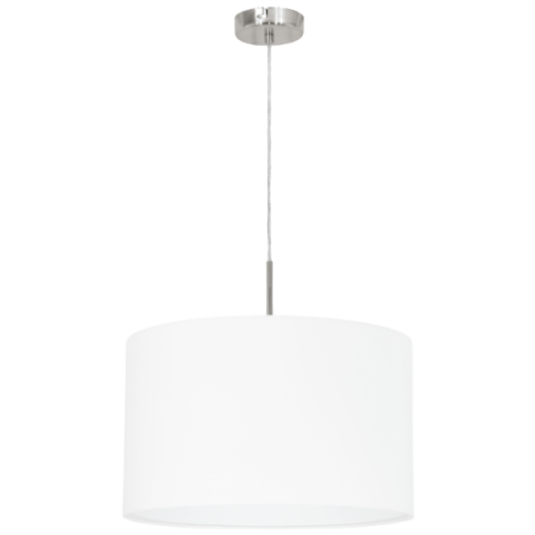 A Pasteri Eglo 31571 függesztett lámpa modern stílusú, fehér-nikkel színű világítótest, amely egy E27 foglalattal rendelkezik. A lámpatest anyaga textil és acél, amely biztosítja a tartósságot és esztétikus megjelenést. A termék átmérője 380 mm, magassága