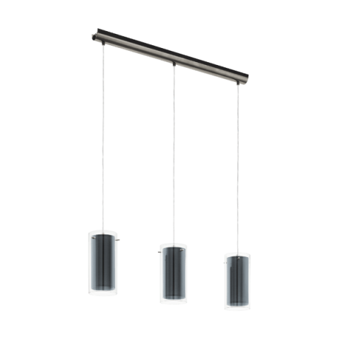 A Pinto Eglo 99286 függesztett lámpa három E27-es foglalattal rendelkezik, amelyek cserélhető fényforrásokkal kompatibilisek. A lámpatest vintage stílusban készült, anyaga üveg, textil és acél, színe áttetsző, szürke és nikkel árnyalatokban jelenik meg. A