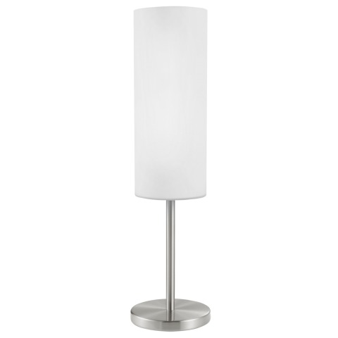 A TROY 3 asztali lámpa matt nikkel bevonatú fémtalppal és fehér szatén üvegből készült hengeres lámpabúrával rendelkezik. Az asztali lámpa egyszerűen be- és kikapcsol a soros kapcsolóval. Egyszerű kialakításának köszönhetően az asztali lámpa szinte bármil..