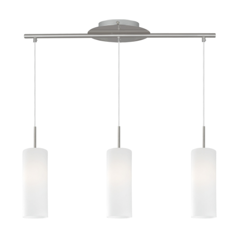 A TROY 3 függőlámpa fémből készült, matt nikkel bevonattal és három felfüggesztett hengeres lámpaernyővel, fehér szatén üvegből. Az egyszerű kialakítás szinte minden belső stílushoz jól illeszkedik, és hangulatos megvilágítást biztosít minden térben, legy..