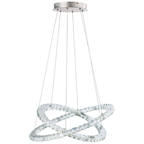 A VARRAZO függőlámpa két króm színű fémgyűrűt tartalmaz egymásban, melyeket szoros sorban elhelyezett tiszta kristályok díszítenek. A kristályelemek mögött beépített LED-ek semleges fehér fényt adnak, és csillogó, csúcsminőségű megjelenést kölcsönöznek, a..