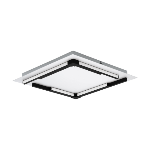 A Zampote Eglo 900329 mennyezeti LED lámpa 25 W teljesítményű, integrált LED modullal szerelt, amely 3300 lumen fényáramot biztosít melegfehér, 3000 K színhőmérsékleten. Modern stílusú, 38x38 cm méretű, 5 cm magasságú lámpatest, fekete-fehér színkombináci