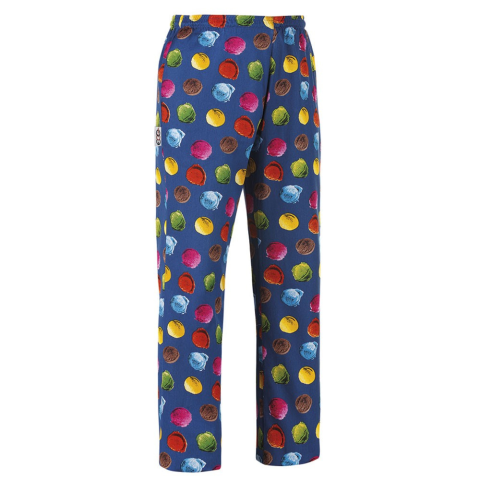 Kifutó termék! Csak a készleten lévő darabszámok elérhetőek! Színes fagylalt gomboccokkal díszített szakácsnadrág teljesen gumírozott derékrésszel, megkötővel, két oldalsó és egy hátsó zsebbel. Anyaga: 100% pamut Méretek: S-3XL A feltüntetett árak bruttó