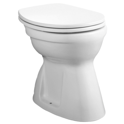 Padlóra könnyedén rögzíthető szaniter WC. Falon kívüli, illetve azon belüli tartályokhoz is illeszthető. A WC lapos öblítésű, alsó kifolyású.