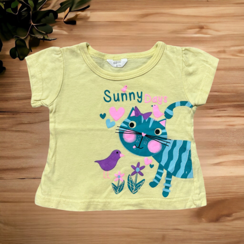 Cicás pamut felső Egyenes szabású, kerek nyakkivágású, elején színes cica mintával. Kellemes pamut anyag. Hibátlan állapotú.