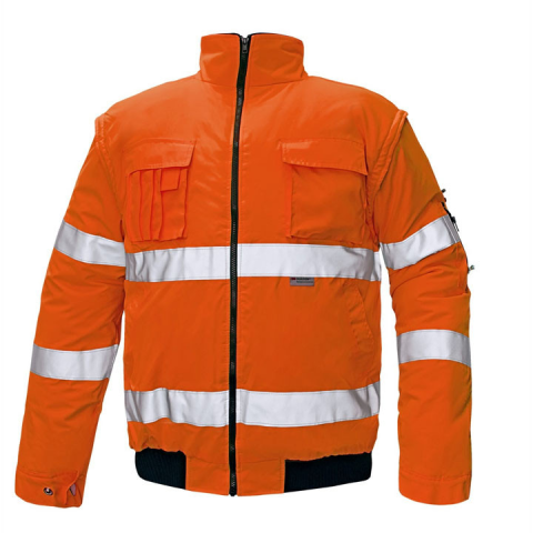 Modern fazonú, mellénnyé átalakítható dzseki Alapanyag: 100 % poliészter 300D Oxford/PU A termék megfelel az EN 340, EN 471, EN 343 szabványoknak. jól láthatósági bélelt dzseki 2 az 1-ben fényvisszavető csíkokkal, EN 471: 3,2 Levehető ujjakkal, mellény