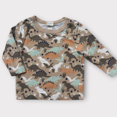Dínószauruszos felső Egyenes szabású, kerek nyakkivágású, vállnál patentos. Kellemes pamut anyag. Hibátlan állapotú.