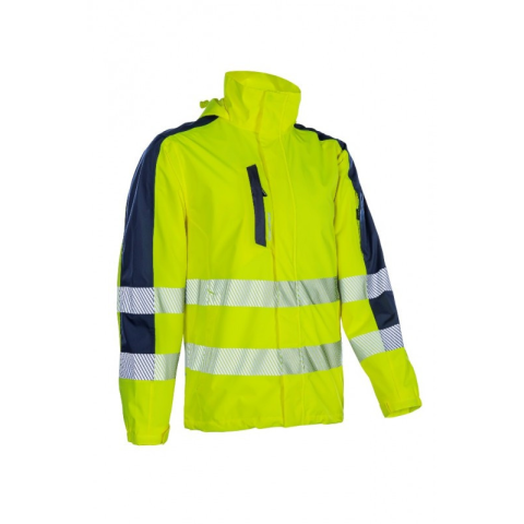 100 g/m2 vastag 2 rétegű Softshell alapanyag: 100% mechanikus stretch poliészter + TPU membrán 100% poliészter hálós bélés a testen ás a karokon és 55 g/m2 vastag 100% poliészter tafeta bélés a kapucniban és a zsebeknél 5 cm széles szegmentált fényvis