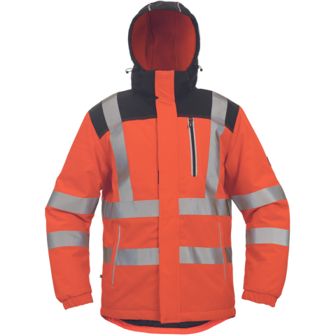 bélelt jólláthatósági télikabát levehető kapucnival, TPU membránnal és hosszított hátrésszel a vállrészen Oxford 600D anyagból készült megerősítő rátétekkel van ellátva 1 kontrasztos színű cipzáras zsebbel, 2 oldalzsebbel, 2 zárható belső zsebbe