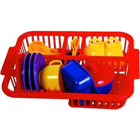Korosztály: 3 - 6 év Mosogasd el a színes edényeket, és utána tedd őket a szárítóba! Az Edényszárító 17 darabos készlet egy műanyag szárító kosarat és rengeteg konyhai eszközt rejt magában. Az edényeket játékkonyhádon is tudod használni, de akár meg is lepheted barátaid egy teadélutánnal vagy egy finom szelet süteménnyel. A csomagban három tányért, két lábos