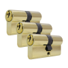 3 db azonos zárlatú hengerzárbetét 5 db edzett csappal, 3 db kulccsal, sárgaréz kivitelben. Bel- és kültéri használatra javasolt. Méret: 30 mm/30 mm.