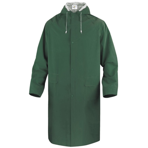 PVC, Poliészter és PVC, zöld színben, XXL-es méretben, zsinórral állítható fix kapucnival. Raglán ujjú, csuklórésze belül gumírozott, varrása hegesztett, elől patenttal záródó, a kar alatt szellőző szemek találhatóak. Hossza 1,20 méter. C3L.011 C3M.021