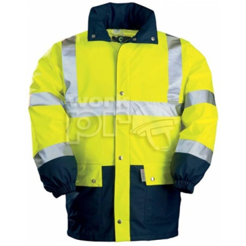 HARBOR PU FLUO ESOKABÁT SÁRGA/SÖTÉTKÉK:170 g/m? vízhatlan, szélálló, varrott plusz hegesztett, 100% poliészter PU borítással5 cm széles fényvisszaverő csíkokálló gallér, rejtett kapucni, cipzáros plusz patentos záródás, két zsebszín: sárga/sötétkékméret: LEU szabvány: EN340, EN343 (3.1), EN I