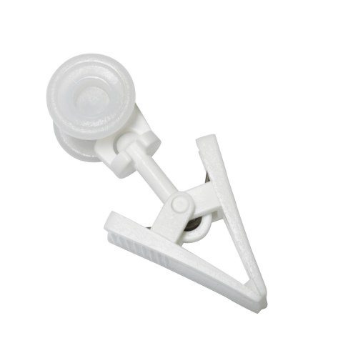 U-sínhez használható görgő csipesszel, fehér színű, fémből és műanyagból készült. Kitűnő minőségű, hosszú élettartamú termék.