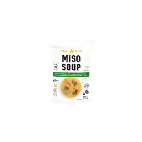 Könnyen és gyorsan elkészíthető, instant miso leves tengeri Wakame algával. Hagyományos japán ízvilággal bír, 3 adagra elegendő miso krémet tartalmaz.