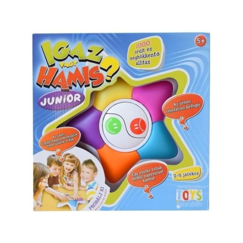 Korosztály: 5 - 10 év Igaz vagy hamis junior társasjátékJátékosok száma: 2-5 játékos,Korosztály: 5 éves kortól ajánlott.1000 elképesztő állítás. Vajon melyik igaz és melyik hamis? Izgalmas ki mit tud az egész családnak. Visszatért a nagysikerű Igaz vagy Hamis? társasjáték egy újabb kiadással - kifejezetten gyerekeknek! Te mindent elhiszel? Most kiderül, hogy ki a le