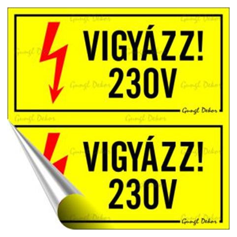 Információs matrica, 10x10 cm, 230 V Vigyázz 230V! információs matrica - anyaga: öntapadós műanyag fólia (vinil) - damil akasztót nem tartalmaz - sárga alapon fekete betűk, piros villám - mérete: 10x10 cm négyzet alakú matrica - 2 db felirattal, a me